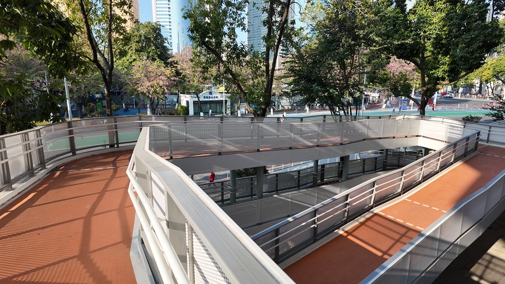 记者在天河体育中心体育场北门看到,二层平台增设了长达700米的环形跑道,还加设了电梯和直达二层平台的无障碍通道,这大大方便了残障人士参加体育运动,同时也为晨练的市民提供了风雨无阻的健身步道。陈月桂表示,天河体育场按照一场馆多场景的运营模式,打造了环形跑道,实现了全线贯通,增强了跑者的体验,全长约700米,离地高度6~8米,可供多人同时进行跑步和健步走,这里实行24小时全天候开放,夜间配有照明设施,方便市民随时来健身。