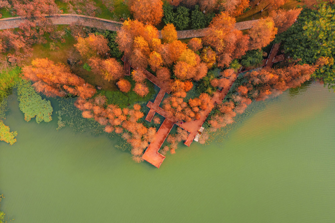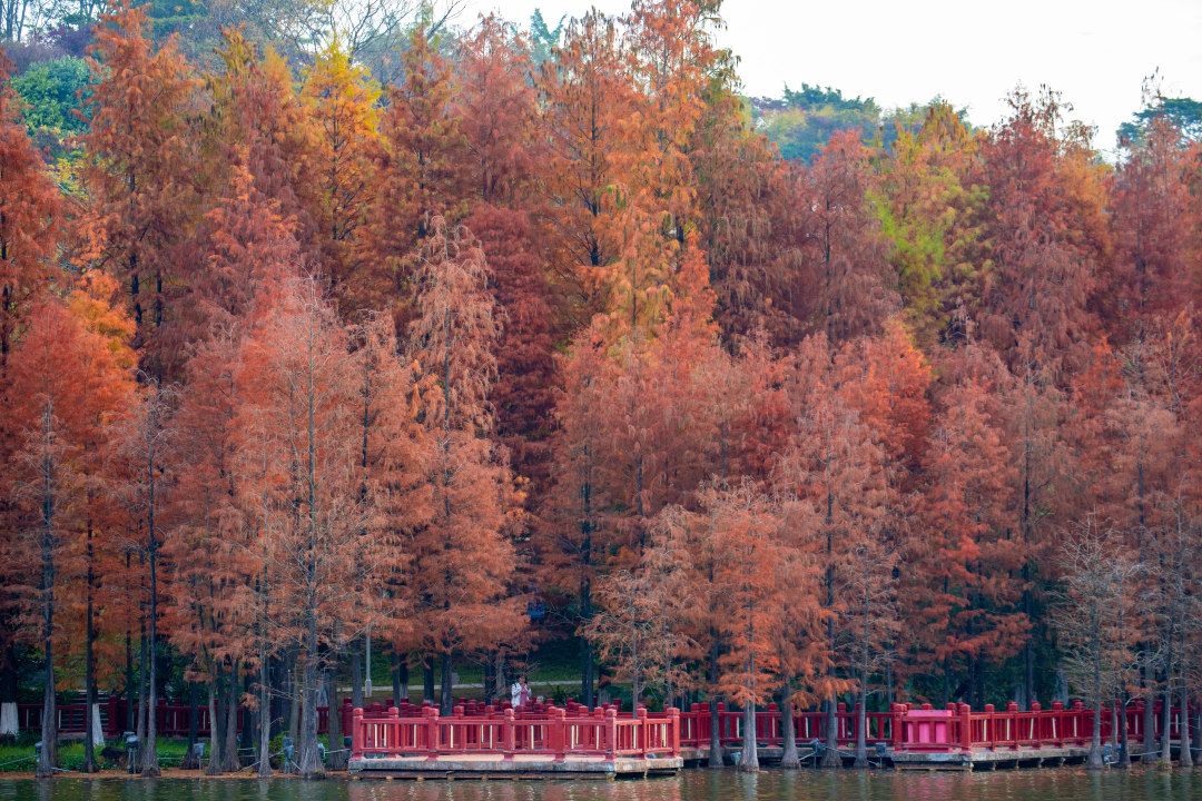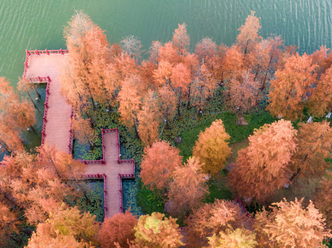九龙湖公园则以色彩层次丰富著称。焦糖色、枫叶橘、落日金交织,仿佛打翻的调色盘。原木色观景平台与橘红色杉林高度契合,游客可登高与树冠合影,或在松软草坪上奔跑起舞,利用平台高低差轻松拍出大片感。