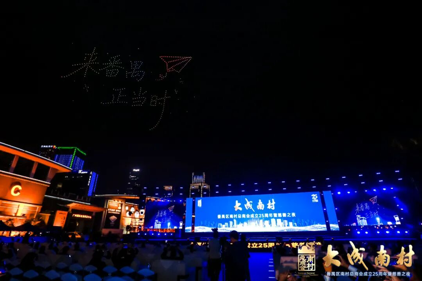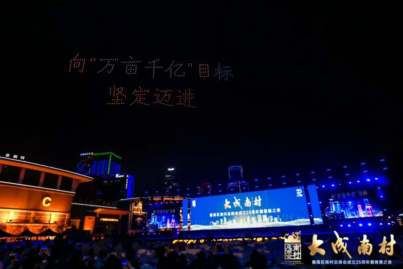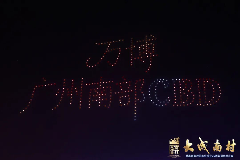 随后,活动进行了无人机表演,以“天空为卷、光影为笔”,绘制一幅“大成南村”的壮丽长卷。“商汇全球 共赢未来”“来番禺 正当时”“番禺智造 万博CBD”“万亩千亿·向善番禺”等点亮天空。