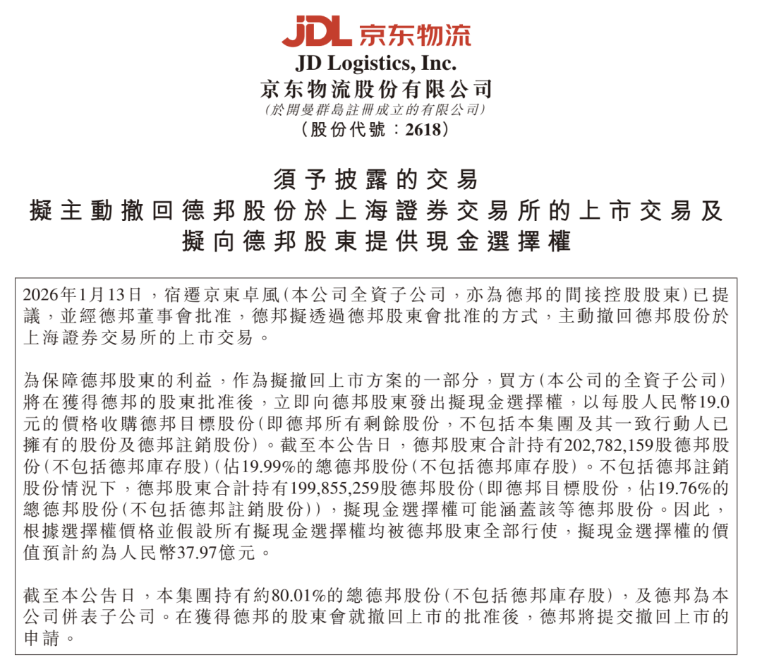 1月13日晚间,德邦股份发出公告称,拟以股东会决议方式主动撤回A股股票在上交所的上市交易,并在取得上交所终止上市决定后,申请在全国中小企业股份转让系统退市板块继续交易。这也是2026年A股市场首家提出主动退市的上市公司。