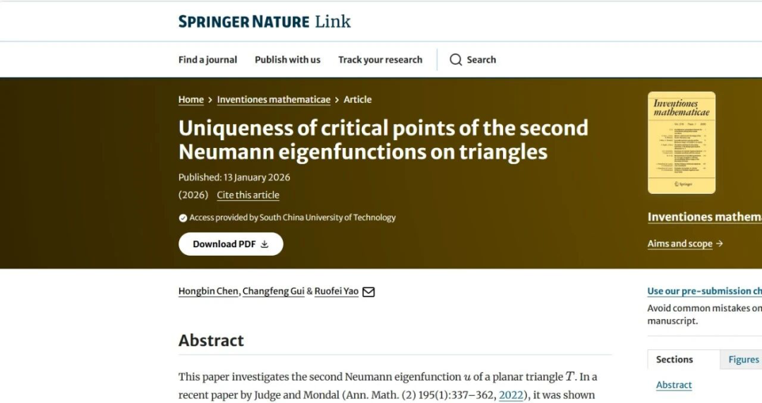 1月13日,华南理工大学数学学院姚若飞副教授与西安交通大学陈红斌教授、澳门大学桂长峰教授合作的论文被世界四大顶尖数学期刊之一的Inventiones Mathematicae(《数学新进展》)在线发表。