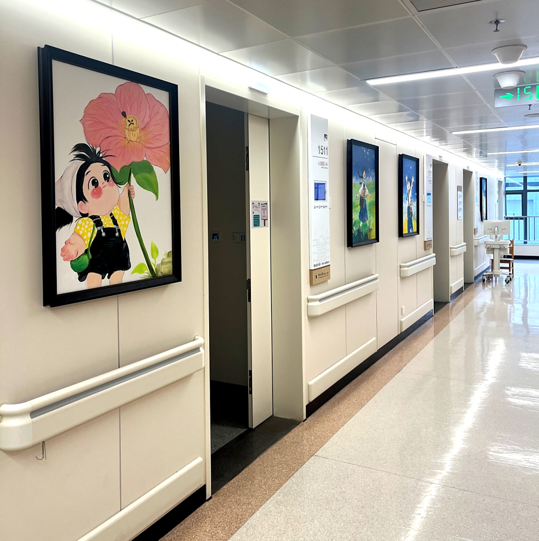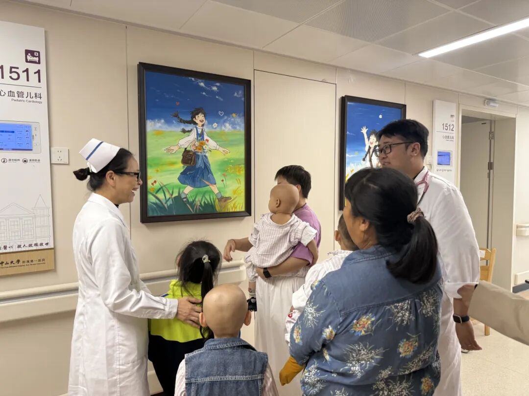 冬日里的广州,温暖的阳光普照大地。1月14日,中山大学附属第一医院(以下简称“中山一院”)心血管儿科病房迎来了一份特别的礼物。患儿宣宣的妈妈、书画老师罗女士和学生们带来了彩色画作装点病区走廊。2024年12月,当时2岁多的宣宣被确诊为第四脑室髓母细胞瘤,从宣宣抗癌至今,罗女士先后共赠画上百幅,让病房走廊变身“爱心画廊”。