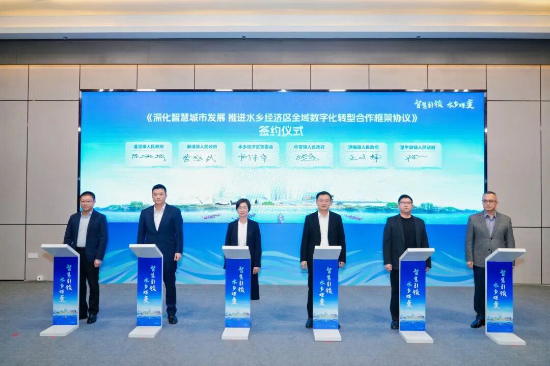 会上,水乡经济区管委会与五镇人民政府正式签署智慧城市合作框架协议,标志着各方将进一步深化系统共建、数据共享与业务协同,共同推动智慧城市建设向纵深发展。
