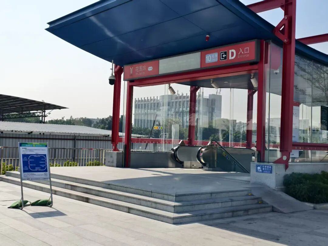 接驳车乘车点位于花围地铁站D口外公交站,具体发班时间为工作日早高峰7:30~8:30,晚高峰17:30~18:30。