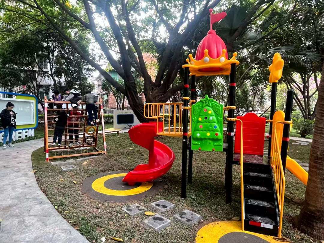 秉持“儿童优先”理念,街道与社区通过实地调研、入户走访、座谈交流,精准收集孩子与家长需求,敲定公园改造方案。采用围合式安全布局,园内配齐荡桥、攀爬架、滑梯等多元设施,兼顾趣味与体能锻炼;种植翠芦莉、冷水花等绿植,打造天然“植物科普角”,让孩子在探索中成长。