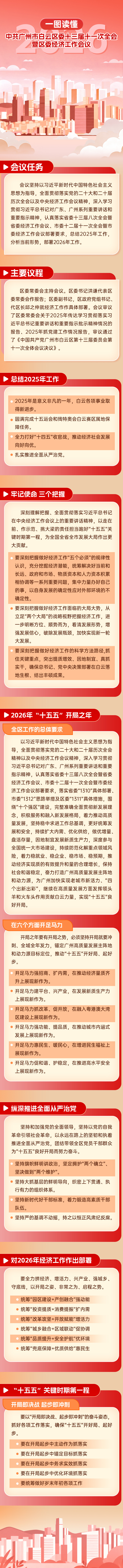 会议指出,2026年是“十五五”开局之年,做好全区工作的总体要求是:以习近平新时代中国特色社会主义思想为指导,全面贯彻落实党的二十大和二十届历次全会精神以及中央经济工作会议精神,深入学习贯彻习近平总书记对广东、广州系列重要讲话和重要指示精神,认真落实省委十三届八次全会暨省委经济工作会议、市委十二届十一次全会暨市委经济工作会议部署要求,落实省委“1310”具体部署、市委“1312”思路举措及区委“1311”具体措施,围绕“十个强区”建设,完整准确全面贯彻新发展理念,积极服务和融入新发展格局,着力推动高质量发展,坚持稳中求进工作总基调,更好统筹发展和安全,持续扩大内需、优化供给,做优增量、盘活存量,因地制宜发展新质生产力,深度参与全国统一大市场建设,持续防范化解重点领域风险,着力稳就业、稳企业、稳市场、稳预期,推动经济实现质的有效提升和量的合理增长,保持社会和谐稳定,奋力打造广州高质量发展主阵地和动力源,为广州加快实现老城市新活力、“四个出新出彩”,继续在高质量发展方面发挥领头羊和火车头作用贡献白云力量,实现“十五五”良好开局。