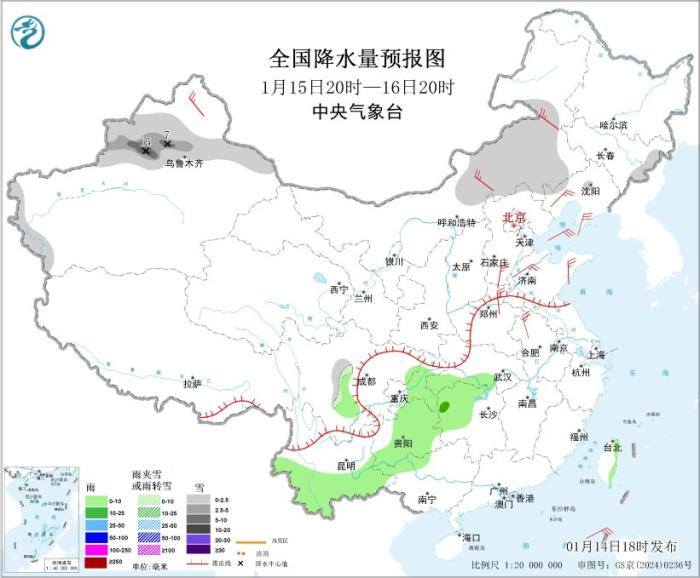 全国降水量预报图(1月14日20时-15日20时)