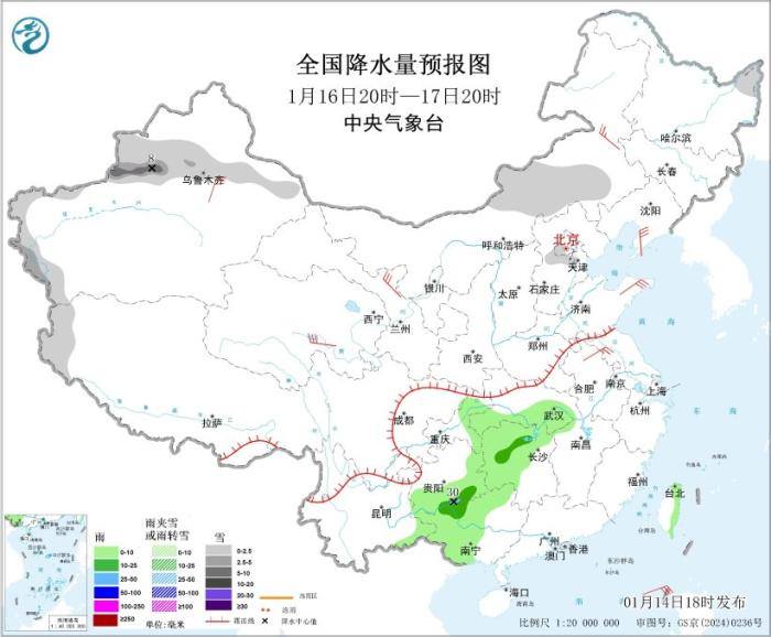 1月16日20时至17日20时,新疆沿天山地区及南疆西部山区、内蒙古东南部、黑龙江东北部、西藏西部等地部分地区有小到中雪,局地大雪(5~8毫米)。湖北南部、湖南西部和北部、重庆东部、贵州东部和南部、广西中西部等地部分地区有小到中雨,局地大雨。新疆北部、青海南部、甘肃河西、内蒙古东部、辽东半岛、山东半岛等地部分地区有4~6级风。渤海、渤海海峡、黄海大部海域、巴士海峡、南海东北部中东部海域将有5~7级、阵风8级风。