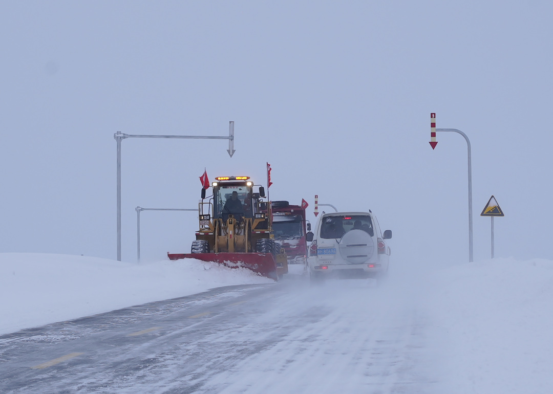 1月13日,新疆阿勒泰公路事业发展中心工作人员驾驶清雪车在辖区公路上除雪。新华社发(毛林别克·胡尔买提汗 摄)