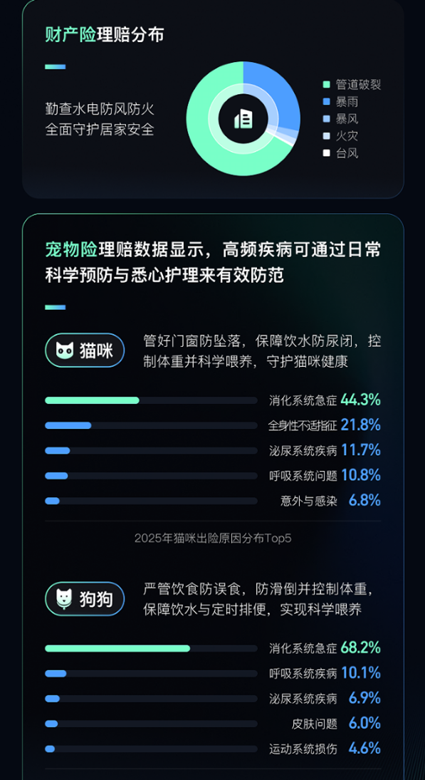 报告同时揭示了不同险种的风险特征。2025年,腾讯微保用户中青少年群体中过敏性鼻炎理赔案件同比增长176.4%;中年人群肝病、高血压风险上升;老年群体癌症理赔案件同比增加39.4%,凸显定期筛查的重要性;车险理赔服务数据显示,车险事故高发于早晚高峰,深夜至凌晨时段事故虽少,但平均理赔金额较白天高出40%;宠物健康方面,宠物猫、宠物狗的医疗理赔均高度集中在消化系统急症,其中宠物狗消化系统急症占比高达68.2%;家财险出险前三位分别是管道破裂、暴雨和暴风。