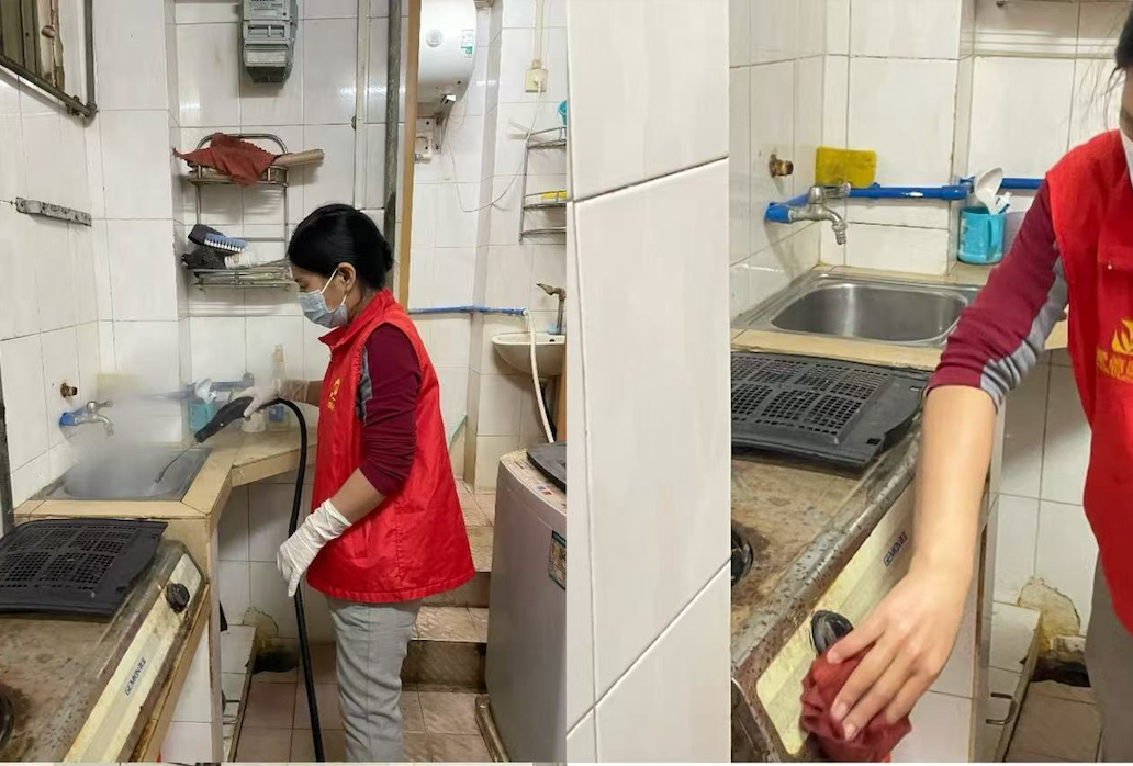 服务现场,工作人员“对症下药”解决清洁难题:为行动不便老人清理高处卫生死角,终结日常清洁盲区;对厨卫等易积垢区域进行专业消杀与深度清洁,彻底清除顽固污渍;为杂物堆积家庭提供分类整理与清运协助,还原整洁舒适的居住空间。