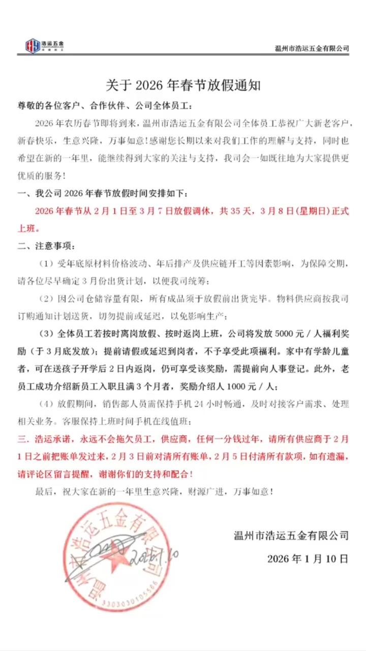 近日,浙江温州一企业发布春节放假通知,引发关注。通知显示,该公司自2月1日起放假,3月8日正式复工,假期共计35天。公司明确,全体员工如按时离岗放假、按时返岗上班,将获得5000元/人的福利奖励,奖励将于3月底发放。