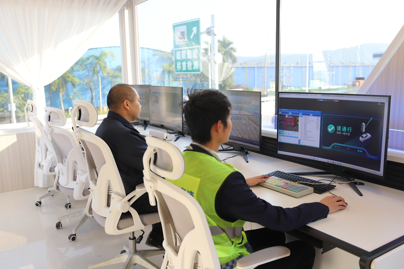 紧邻站场的云舱内,工作人员正在监测车辆通行情况