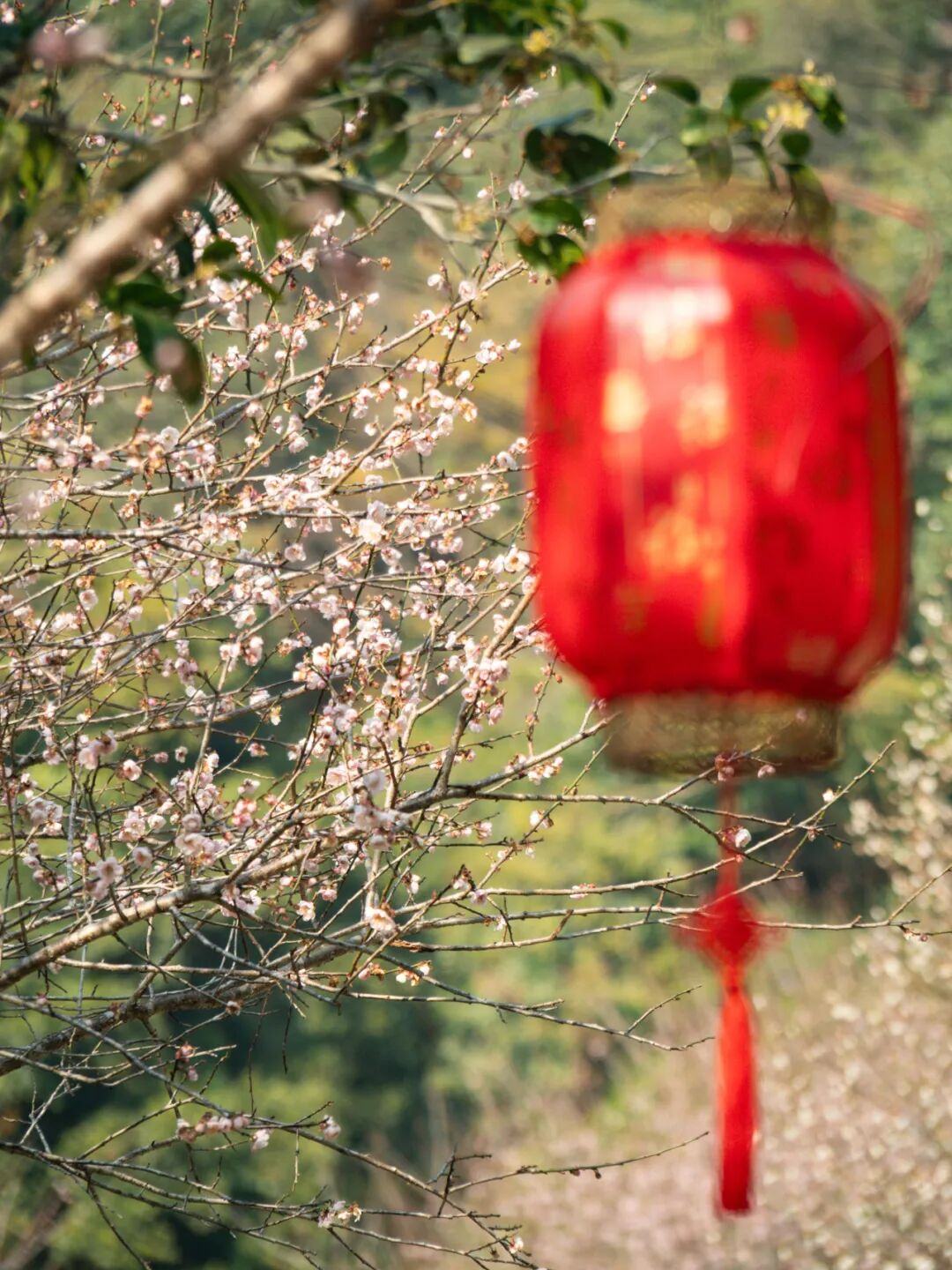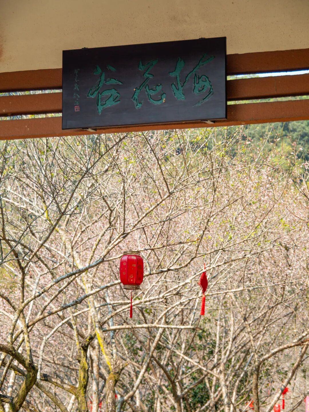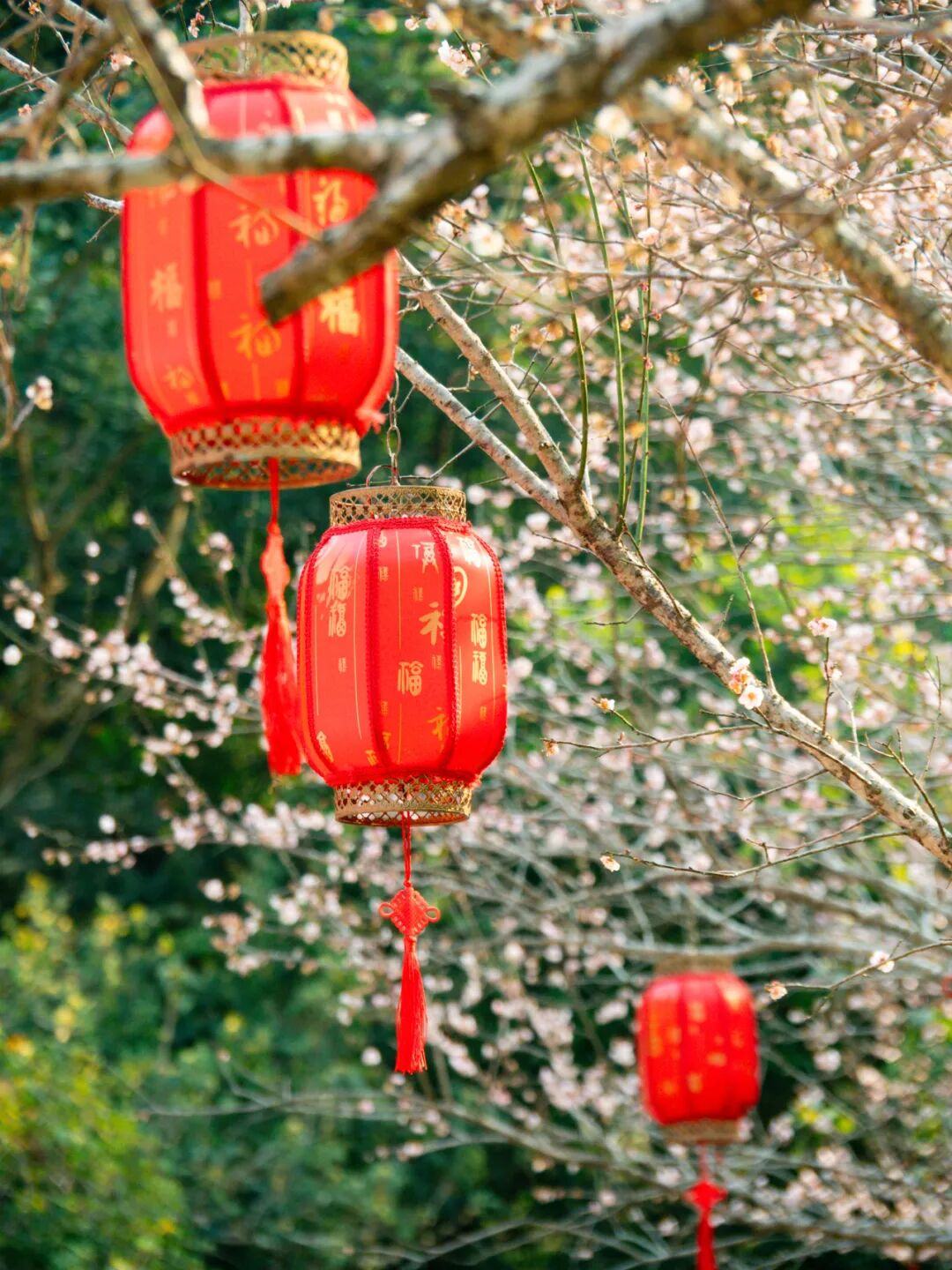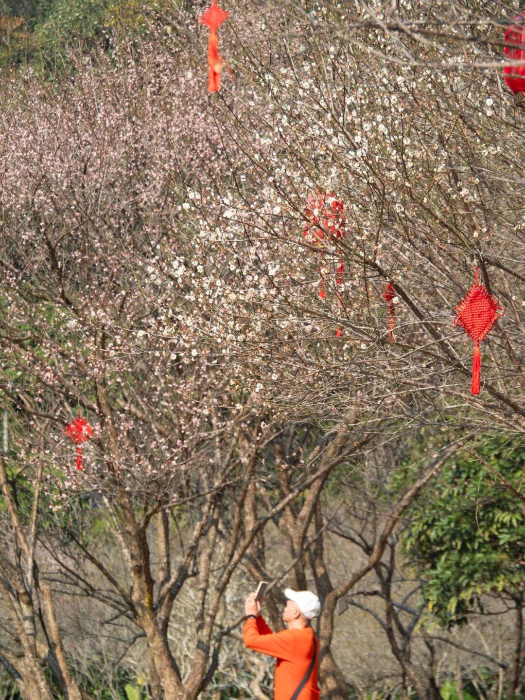梅花谷中的红灯笼与粉梅、白梅相映,诗意十足。
