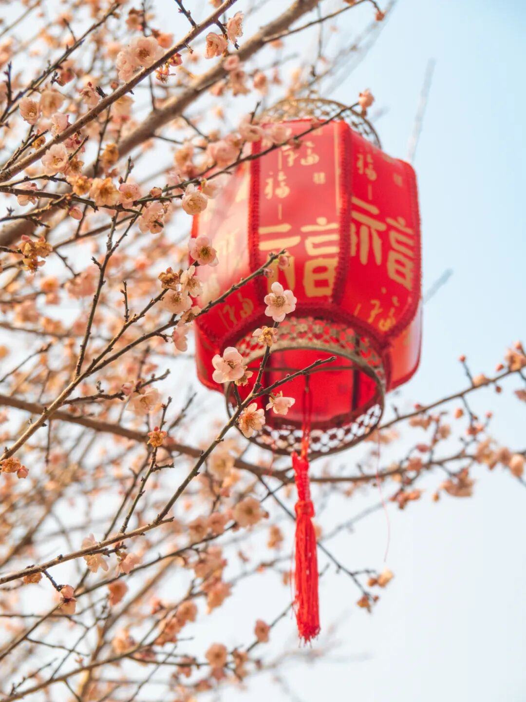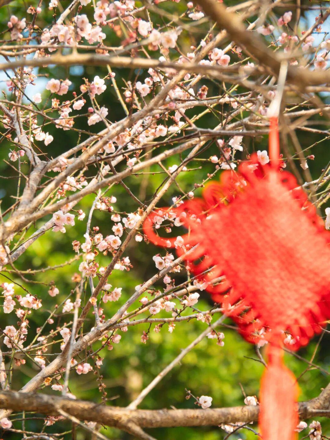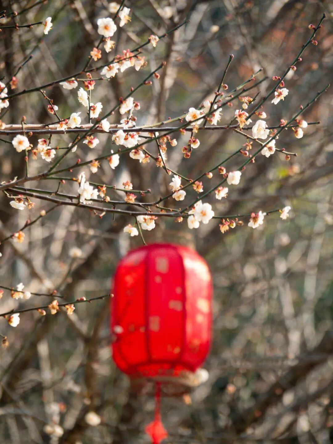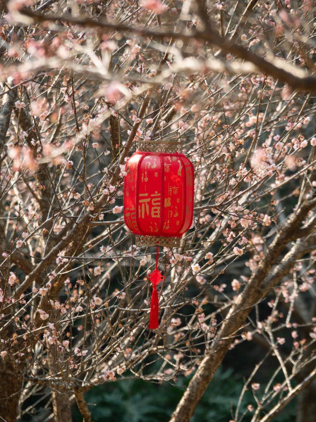 梅花谷中的红灯笼与粉梅、白梅相映,诗意十足。