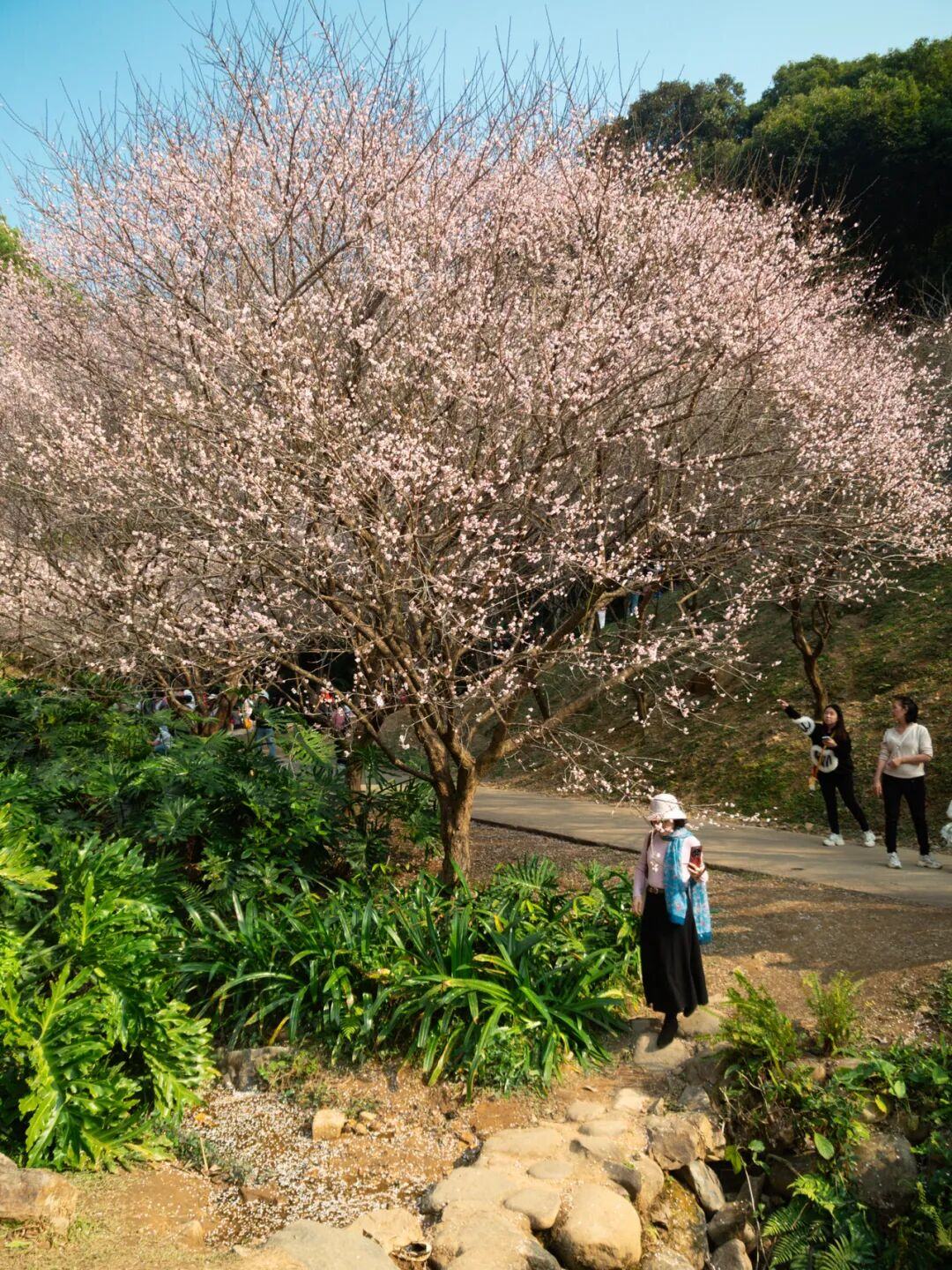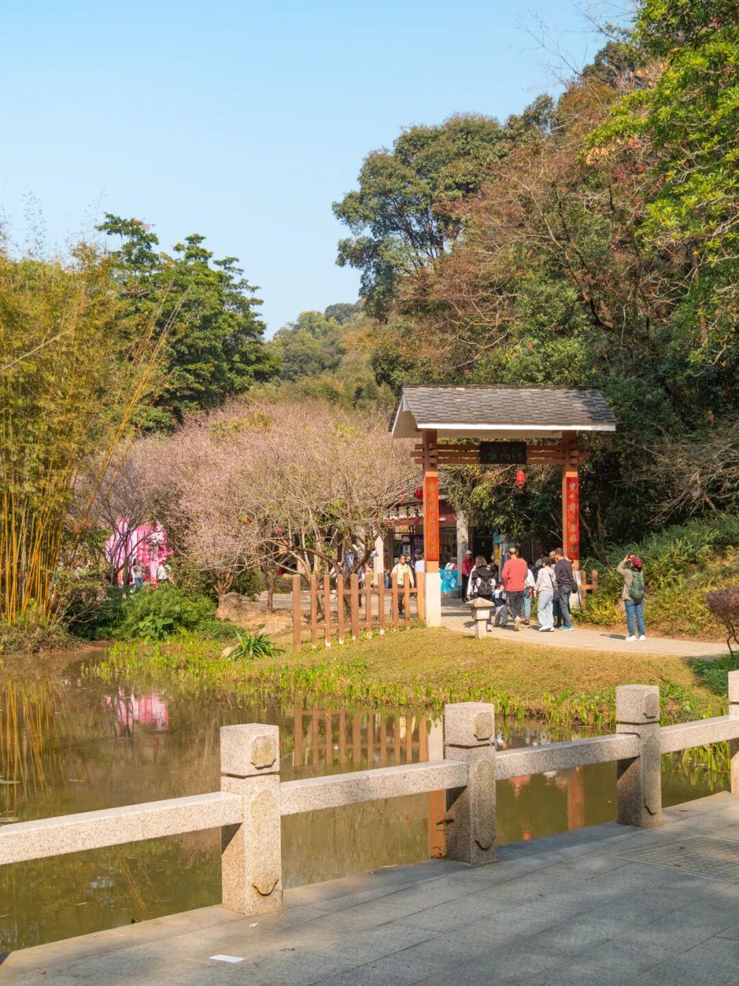 梅花谷的景观层次丰富,既有成片梅林可赏,也有亭台水畔的独株梅树点缀。