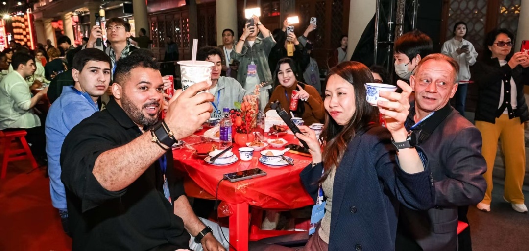 美食品鉴环节同样精彩纷呈。潮菜泰斗钟成泉大师现场讲解美食文化,卤鹅、猪脚饭等地道佳肴轮番呈现。席间,雄浑的英歌舞在小公园内上演助兴,潮语歌曲《我爱潮汕小吃》唱出浓浓烟火气,方言吉祥话互动拉近彼此距离,气势磅礴的《潮汕大锣鼓》压轴收尾。整场活动将广东美食体验与文化展演完美融合,让外宾在沉浸式体验中感受广东待客之道的热情,也让岭南文化的独特魅力随着佳肴与乐声深入人心。