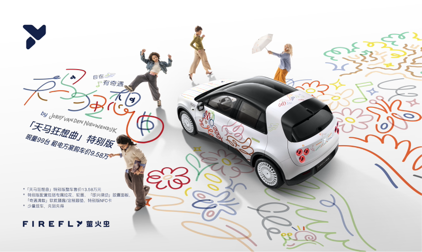 1月15日,firefly萤火虫与荷兰当代艺术家Jordy van den Nieuwendijk联袂创作,推出“天马狂想曲”特别版车型,限量发售99台。该特别版车型专为追求审美和自我表达的时尚人群打造,它以“天马行空”为设计理念,通过艺术家充满活力与趣味的手绘笔触勾勒出飞行云端的自在天马,彰显品牌自在格调,让firefly萤火虫成为城市移动的艺术品。
