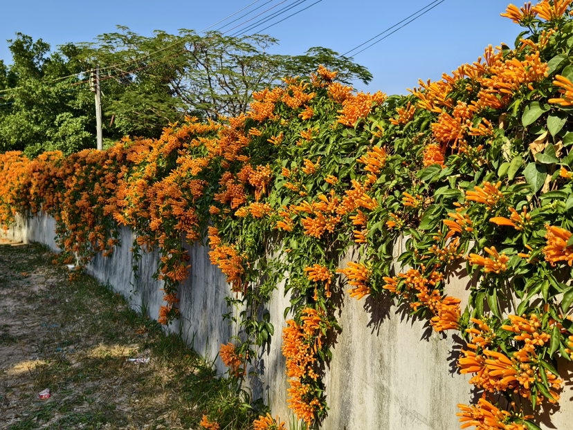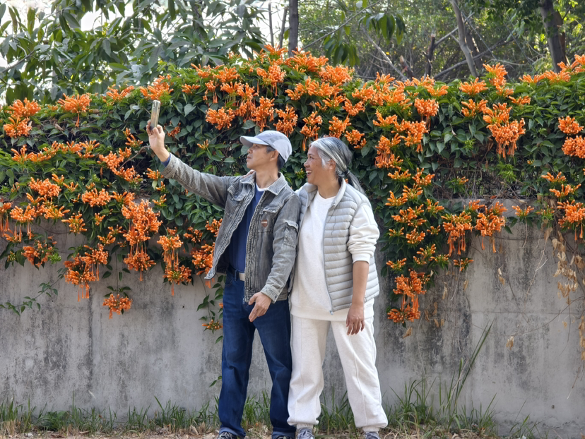 橙黄鲜艳的花串从墙头垂落,连绵如瀑,在阳光下显得生机勃勃。一位游客感叹:“看到这些炮仗花,仿佛春天已经来了。”