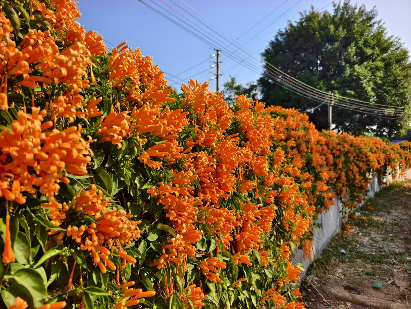 在石碁镇大刀沙村观龙桥桥头,百米长的墙头“燃”了起来,繁密的炮仗花灿烂绽放,形成一道灿若橙色瀑布的花墙,在冬日里格外抢眼。