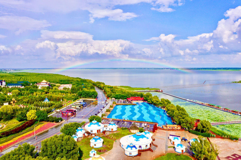 2024年8月26日,游客在查干湖拍照留念。参考冬捕节的成功经验,当地在春、夏、秋季分别举办捺钵开湖节、圣湖荷花节、湿地观鸟节等节庆活动,打造“四季的查干湖”。
