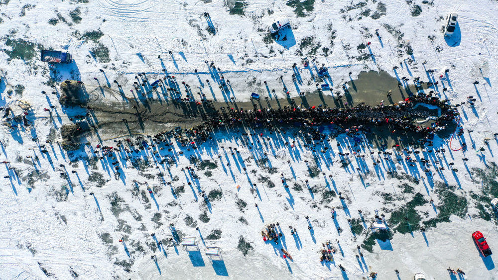 2021年12月26日,游客在查干湖冰面上观看冬捕。近年来,查干湖在保护生态环境的基础上,推动冬捕的可持续发展,通过科学规划捕捞量、加强渔业资源管理等措施,确保查干湖渔业资源的稳定增长。