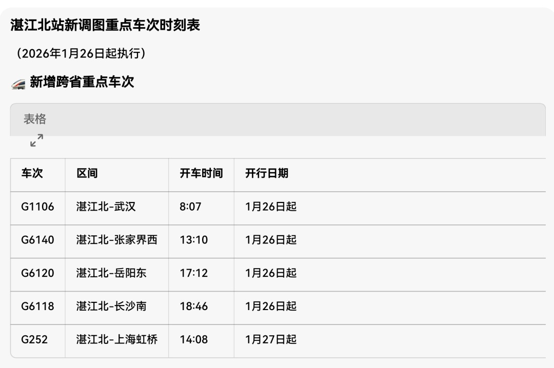 2026年1月26日零时起,湛江北站将实施新的列车运行图,新增多趟始发终到的跨省高铁,粤西地区旅客出行将迎来全新升级。