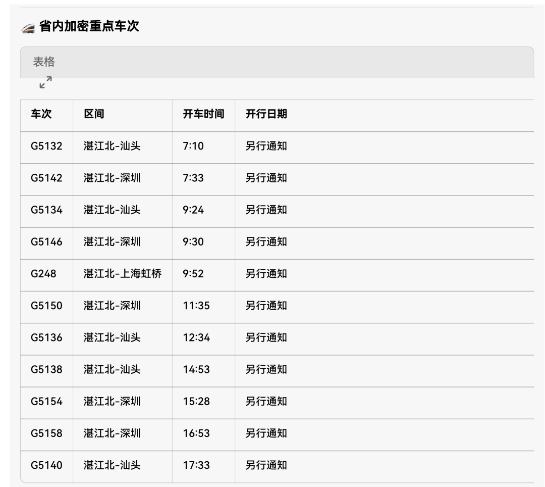 除了跨省线路,湛江北站还加密了前往粤东及珠三角的高铁班次: