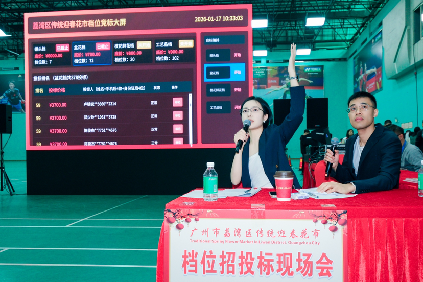 2026年1月17日,广州荔湾体育馆内人头攒动,一年一度的荔湾区传统迎春花市档位招标大会在此举行,为新一年的花市拉开序幕。本次招标共推出211个档位,分为棚头档、盆花档、枝花鲜花档、工艺品档四大类。经过数小时的紧张竞投,所有档位顺利拍出,印证了荔湾花市在市民中的吸引力。其中,广州风行乳业股份有限公司以50100元一举拿下头彩,夺得“标王”。