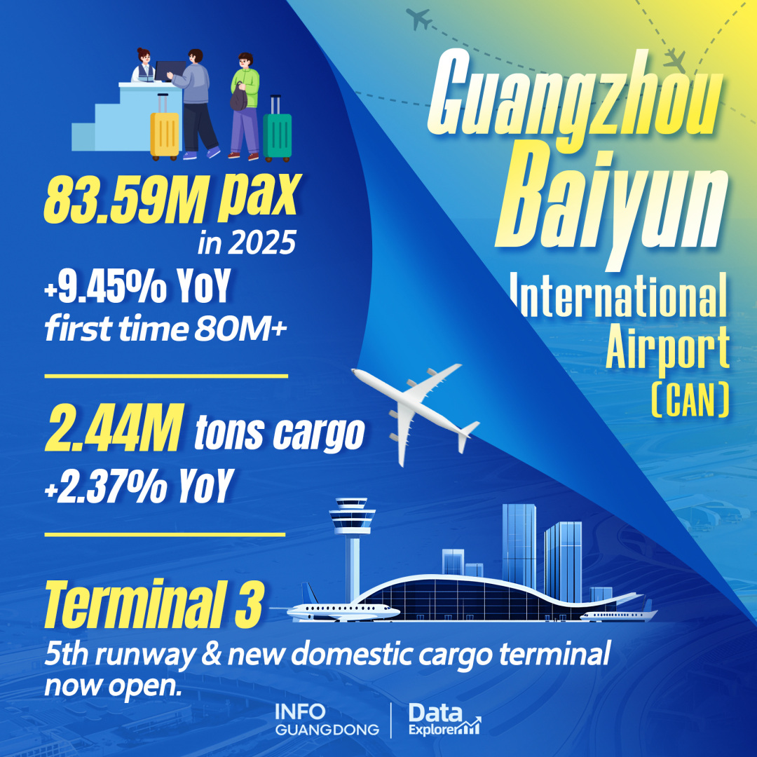 In 2025, Guangzhou Baiyun International Airport (CAN) handled 83.59 million passengers, up 9.45% year on year, while cargo and mail throughput reached 2.44 million tonnes. International passenger traffic rose sharply to 17.45 million, accounting for more than 20% of total traffic. The opening of Terminal 3 and a fifth runway, along with a new domestic cargo terminal, significantly expanded the airport’s capacity to move both people and goods.