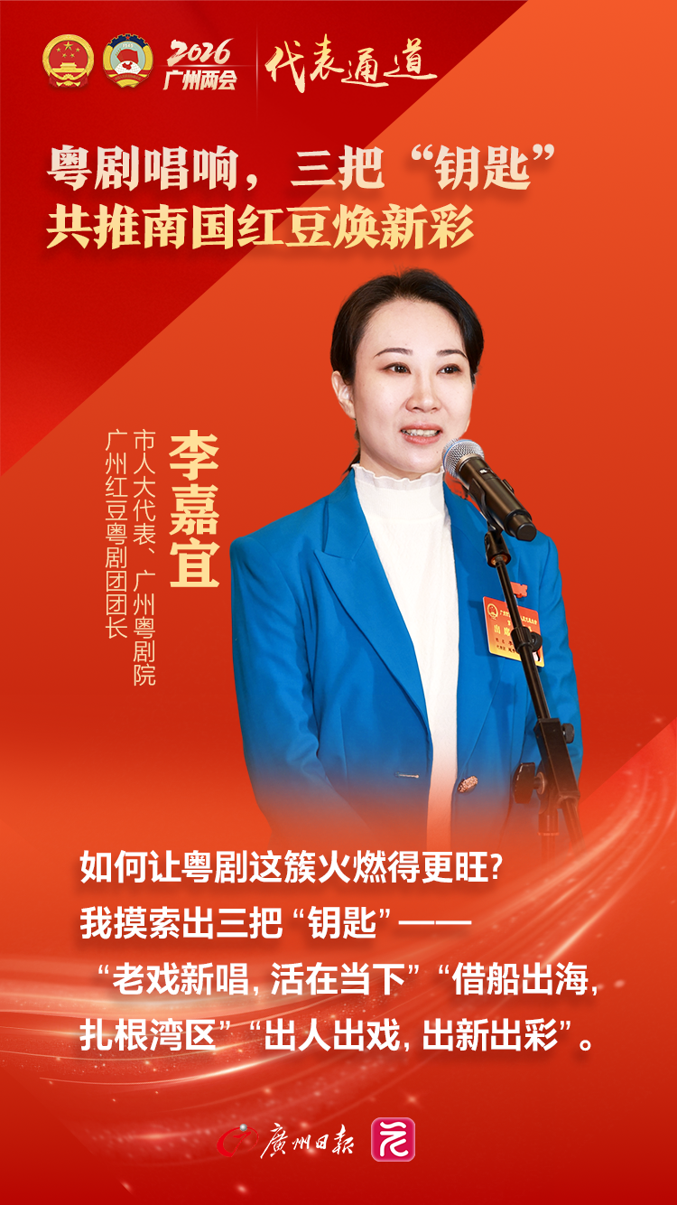 粤剧被誉为南国红豆。如何把粤剧打造成大湾区鲜活的文化名片,让岭南文化艺术瑰宝焕发新活力?1月19日,在广州市十六届人大六次会议首场“代表通道”上,广州市人大代表、广州粤剧院广州红豆粤剧团团长李嘉宜带来了三把“钥匙”。