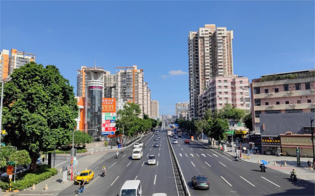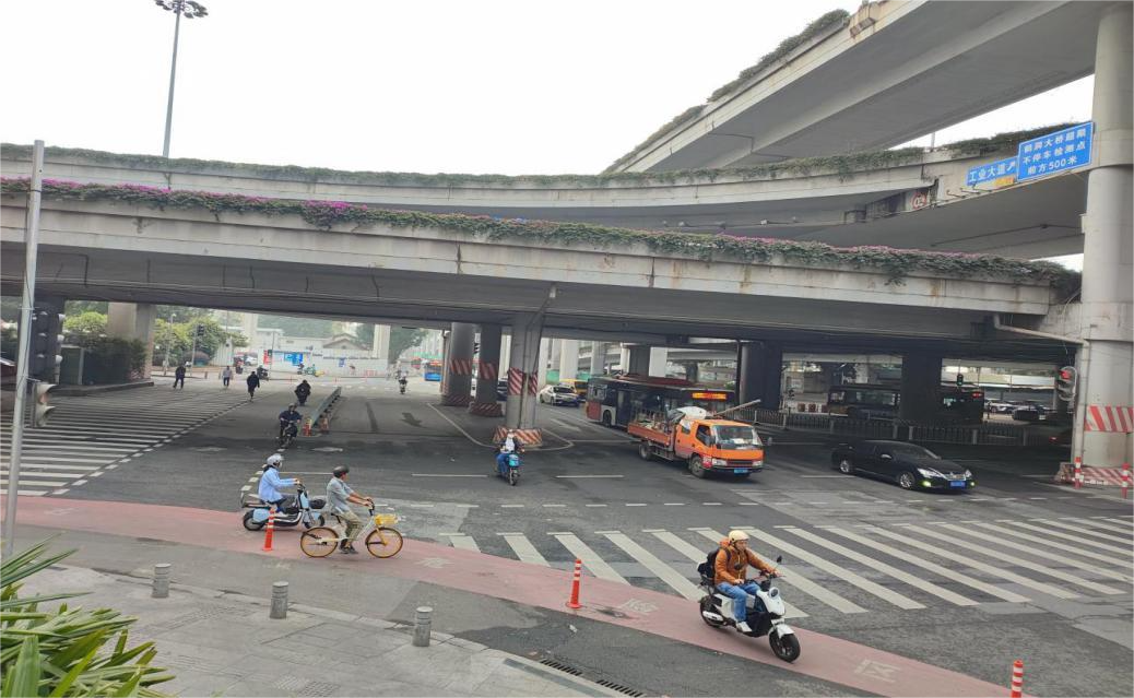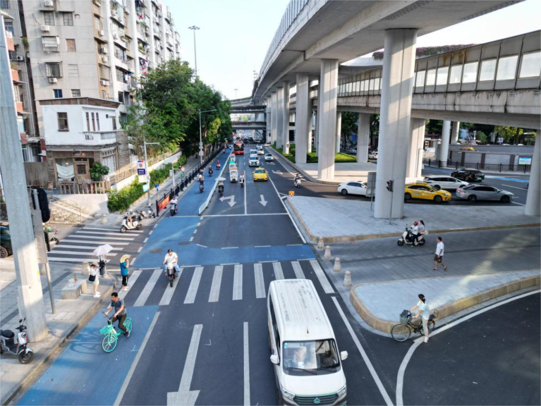 针对工业大道部分路段非机动车道宽度不足的问题,本次改造创新设置“共享车道”,将最右侧机动车道与既有非机动车道合并,利用1.1米高隔离护栏与左侧车道分隔,形成宽度不低于3.25米、限速40km/h以下的连续通行空间。改造后,非机动车通行量提升50%以上,机动车通行未受明显影响,较好地平衡了两类车辆的通行需求。