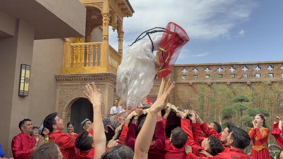 当地年轻人在中国新疆民族乐器村举行婚礼