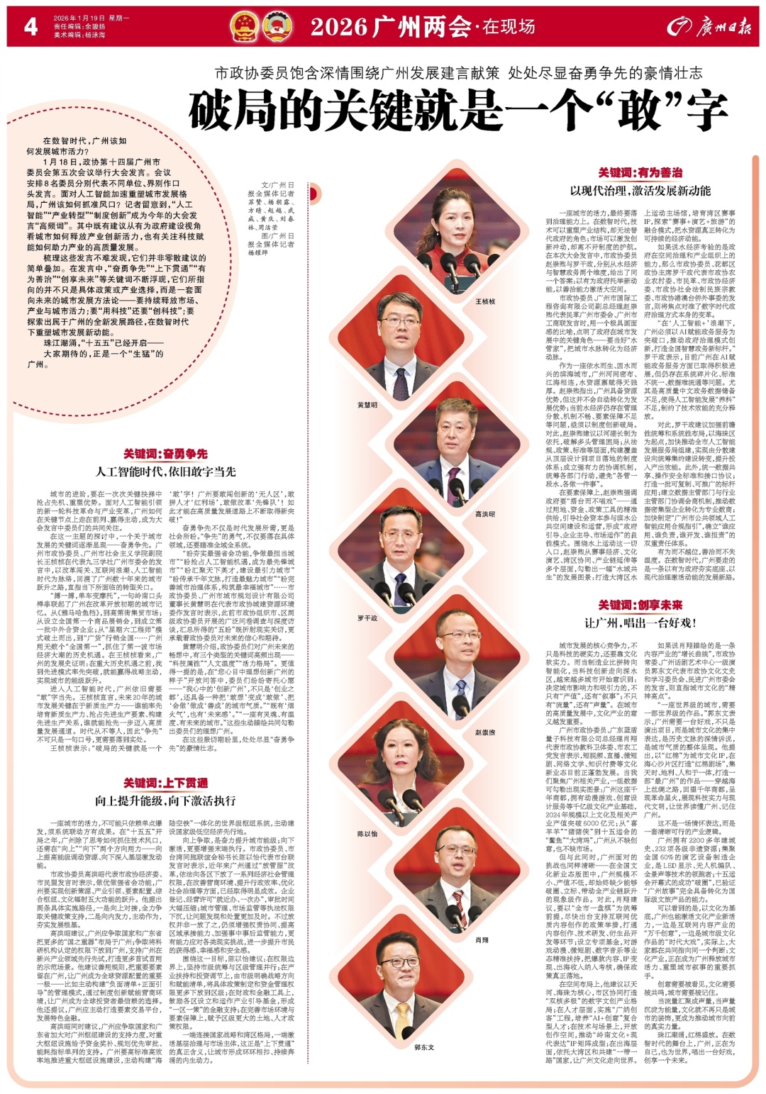 梳理这些发言不难发现,它们并非零散建议的简单叠加。在发言中,“奋勇争先”“上下贯通”“有为善治”“创享未来”等关键词不断浮现,它们所指向的并不只是具体政策或产业选择,而是一套面向未来的城市发展方法论——要持续释放市场、产业与城市活力;要“用科技”还要“创科技”;要探索出属于广州的全新发展路径,在数智时代下重塑城市发展新动能。