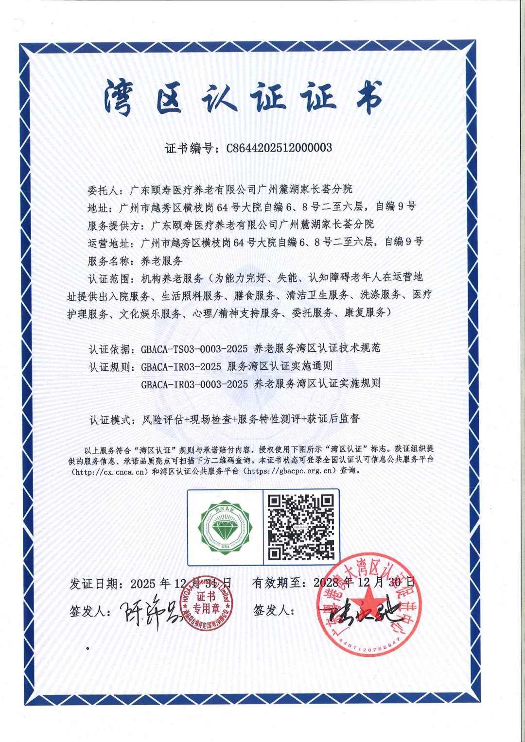 1月20日,全国首张养老服务“湾区认证”证书授证活动在广东颐寿医疗养老有限公司广州麓湖家长荟分院举行,颐寿麓湖家长荟获颁该证书。据悉,这是广州市服务领域的首张“湾区认证”证书,是越秀区以“高端品质”赋能银发经济的创新实践。