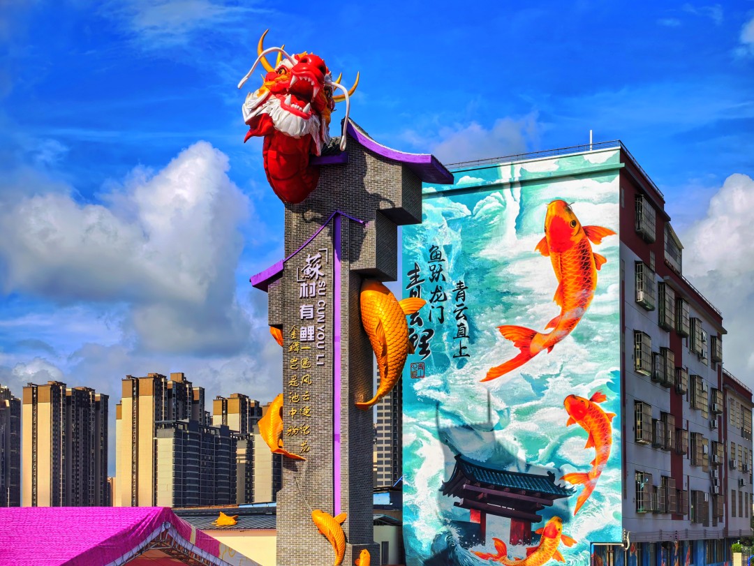 漫步在苏村村的锦鲤文化街区,巨幅的锦鲤墙绘跃然眼前,清澈的锦鲤池中鱼儿嬉戏,转运水车缓缓转动,带起片片涟漪。这里的一砖一瓦、一景一物都浸润着“锦鲤”文化的寓意与美感。这个曾经“空心”的小渔村,通过深度挖掘西江渔稻文化,创造性地构建起“金鳞化龙”“七愿锦鲤”“鱼尾龙”三级IP体系,并以此统领整村艺术化改造,一跃成为全网流量超千万的网红打卡地,走出“文化引领—风貌蝶变—整村运营”乡村振兴发展新路径。