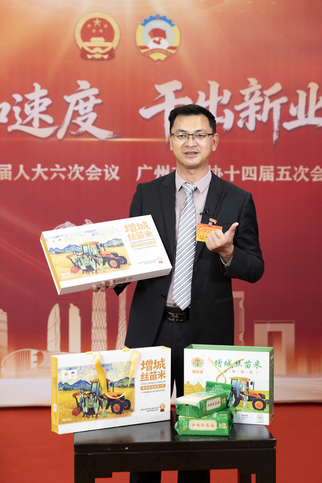 荔枝、丝苗米、迟菜心,是广州增城广为人知的三种中国国家地理标志产品。为了给家乡的特产带货,广州市人大代表、广州长洲岛都市农业产业园有限公司董事长宋俊文拎着两袋沉甸甸的丝苗米来到两会会场。