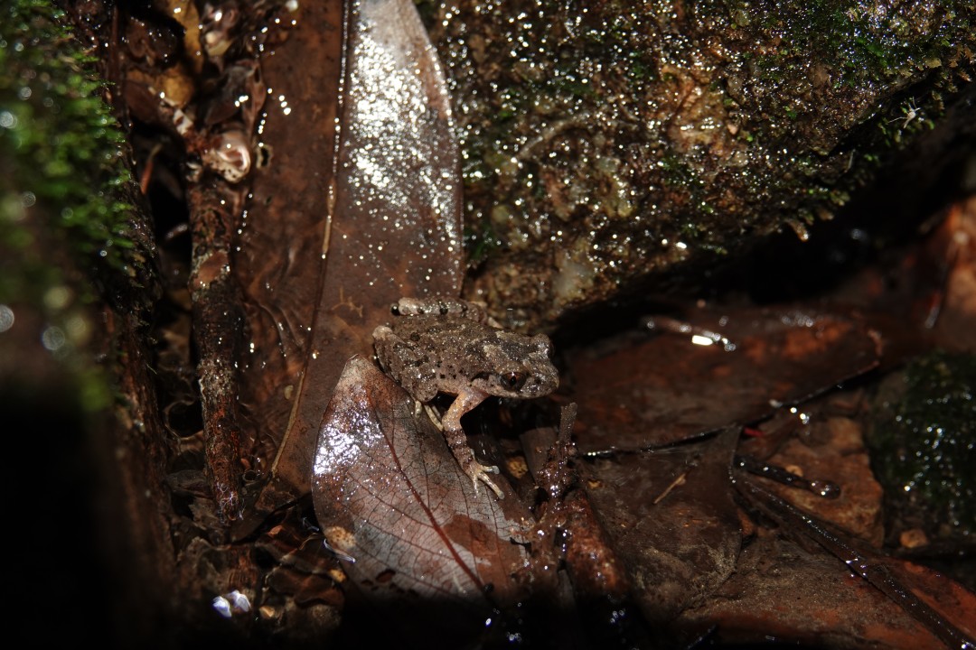 角蟾科掌突蟾属,体型小巧,生活在山区的溪流边坡和溪流石砾中,体色与环境高度相似,善于隐藏于落叶层或石缝中。