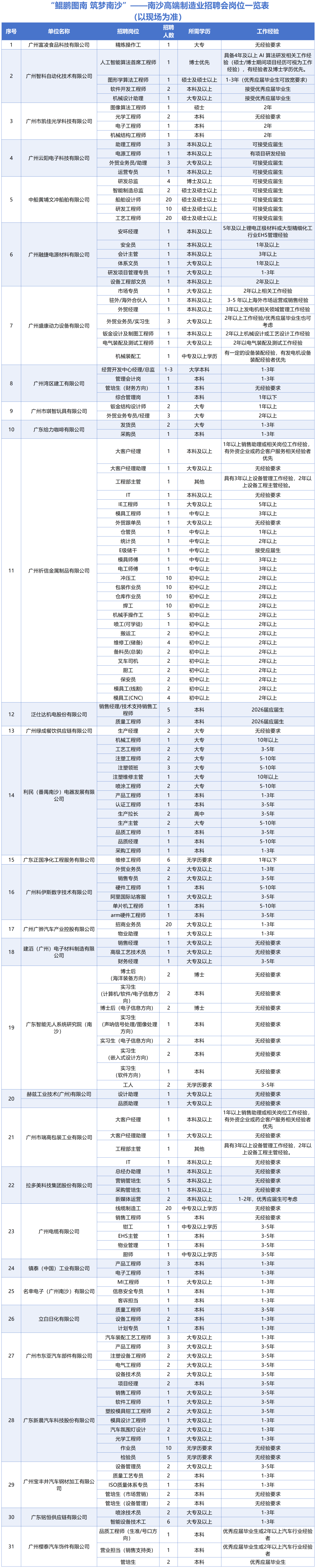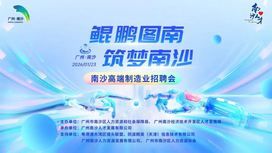 为深入贯彻“百万英才汇南粤”行动计划,扎实推进“万名英才聚南沙”行动落地,聚焦高端制造业高质量发展核心需求,1月23日,南沙区人社局、南沙开发区人才发展局联合主办“鲲鹏图南 筑梦南沙”——南沙高端制造业综合招聘会!携30家重点企业提供的超270个高薪岗位集中亮相,邀你扎根湾区核心,解锁制造业黄金职业赛道!