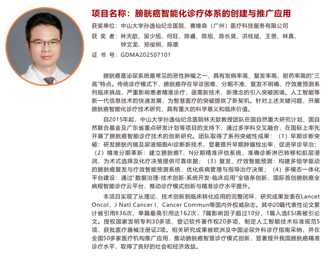 “膀胱癌智能化诊疗体系的创建与推广应用”,中山大学孙逸仙纪念医院林天歆教授为第一完成人;