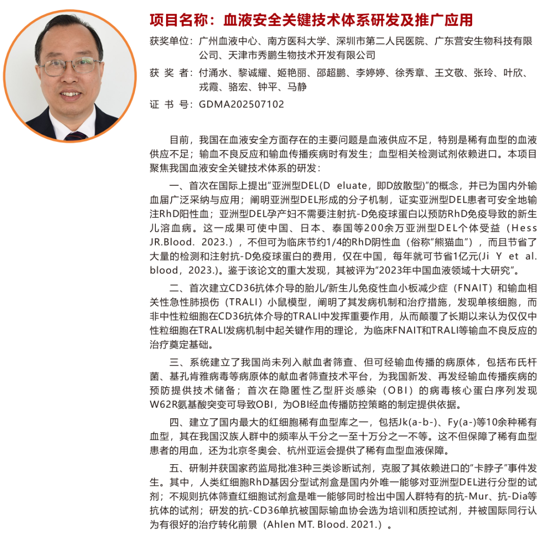 “血液安全关键技术体系研发及推广应用”,广州血液中心付涌水教授为第一完成人;