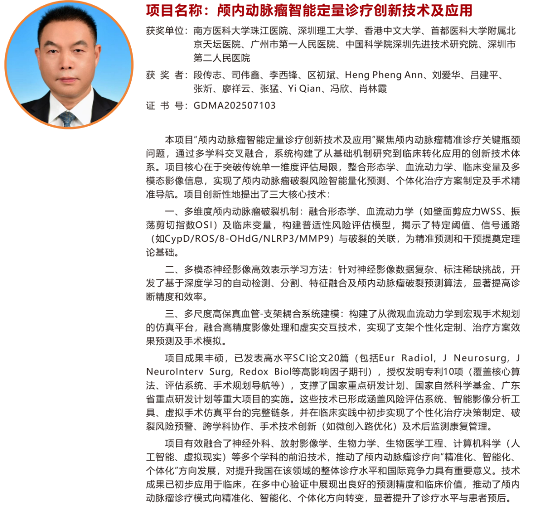 “颅内动脉瘤智能定量诊疗创新技术及应用”,南方医科大学珠江医院段传志教授为第一完成人;