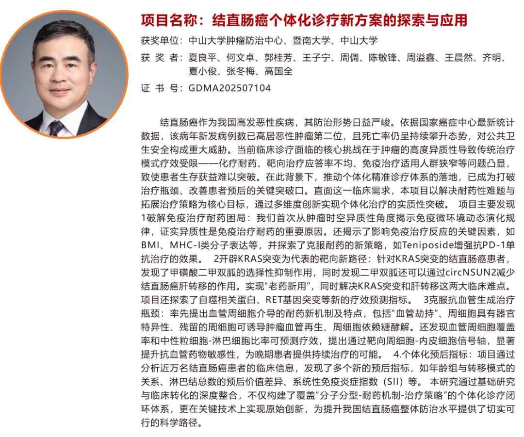 “结直肠癌个体化诊疗新方案的探索与应用”,中山大学肿瘤防治中心夏良平教授为第一完成人;
