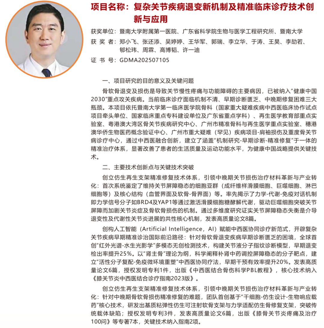 “复杂关节疾病退变新机制及精准临床诊疗技术创新与应用”,暨南大学附属第一医院郑小飞教授为第一完成人;