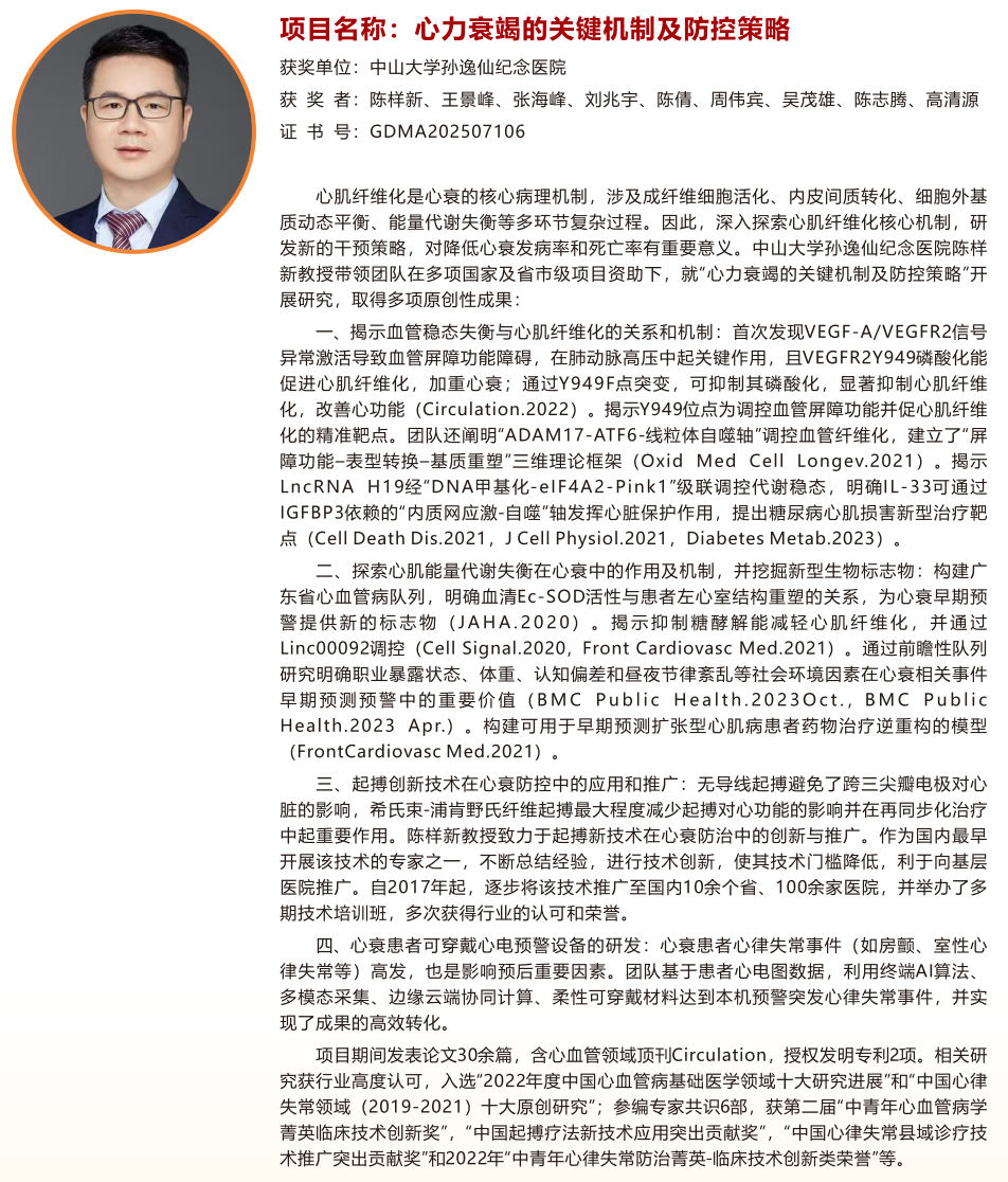 “心力衰竭的关键机制及防控策略”,中山大学孙逸仙纪念医院陈样新教授为第一完成人;
