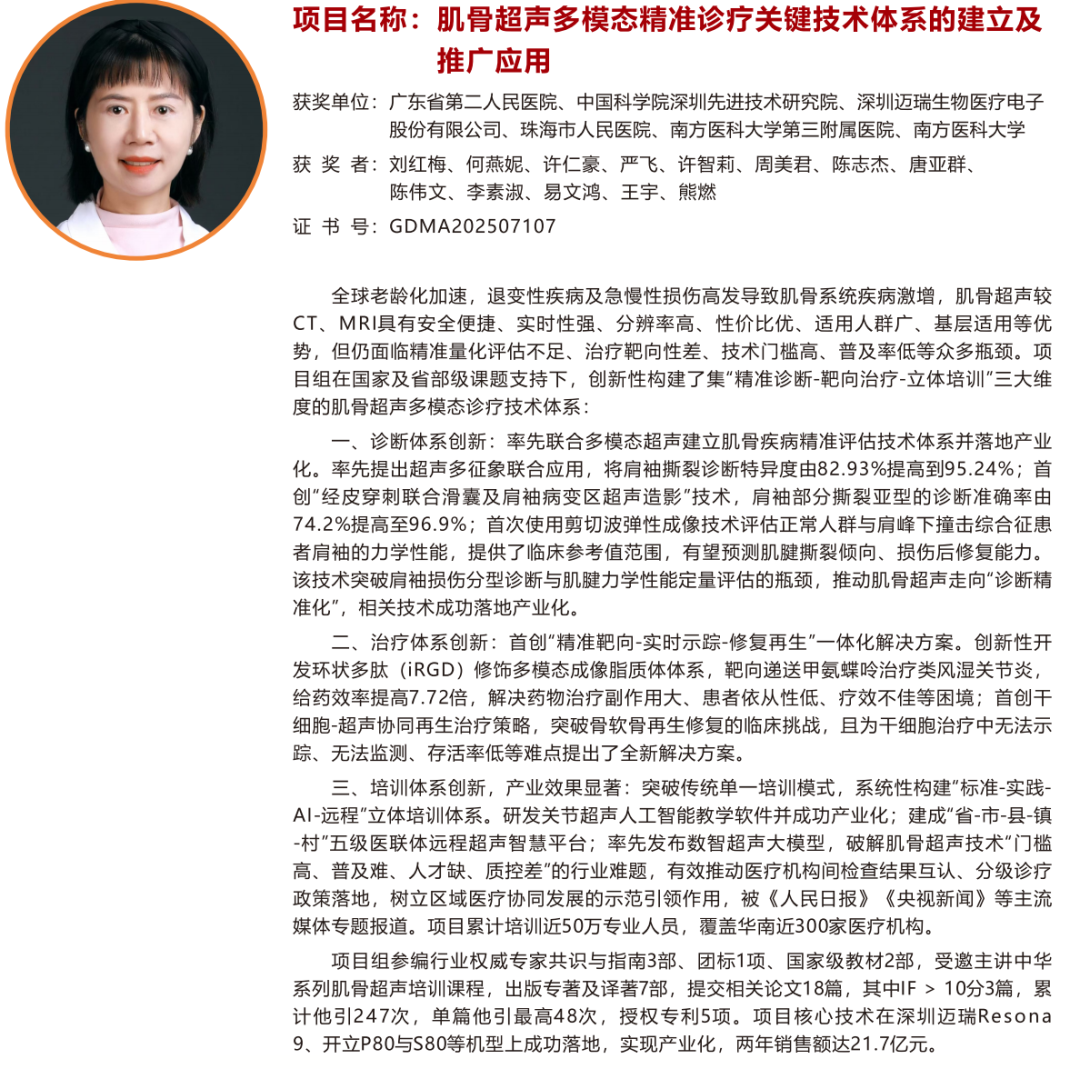 “肌骨超声多模态精准诊疗关键技术体系的建立及推广应用”,广东省第二人民医院刘红梅教授为第一完成人;