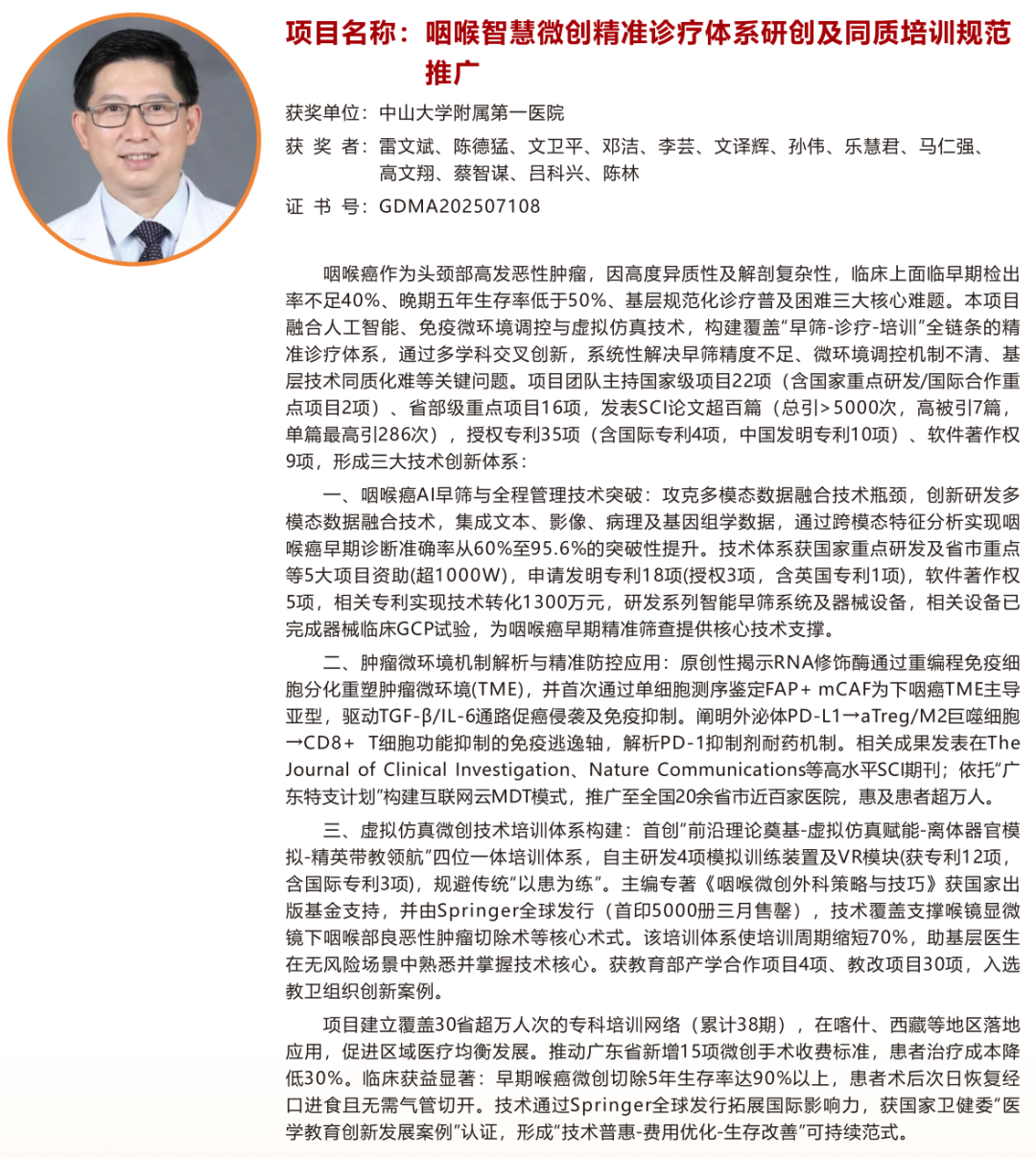 “咽喉智慧微创精准诊疗体系研创及同质培训规范推广”,中山大学附属第一医院雷文斌教授为第一完成人。