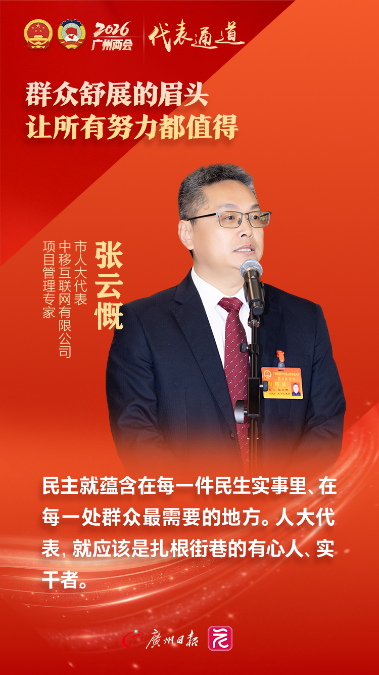 1月21日,广州市十六届人大六次会议“代表通道”上,市人大代表、中移互联网有限公司项目管理专家张云慨在本届任期内提交了20多件建议,涵盖养老、交通、环保等多个市民关切的民生领域,每一件都紧扣群众急难愁盼。通过民生实事,他分享了对“人民选我当代表,我当代表为人民”的理解与践行。