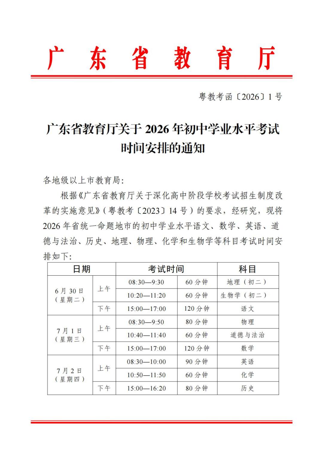 广州中考何时举行?按照2023年8月印发的《广东省教育厅关于深化高中阶段学校考试招生制度改革的实施意见》,道德与法治、语文、历史、数学、外语、物理、化学、地理、生物学科目笔试时间全省统一。这意味着,2026年广州中考录取计分科目笔试时间同样为6月30日至7月2日,与2025年、2024年保持一致。