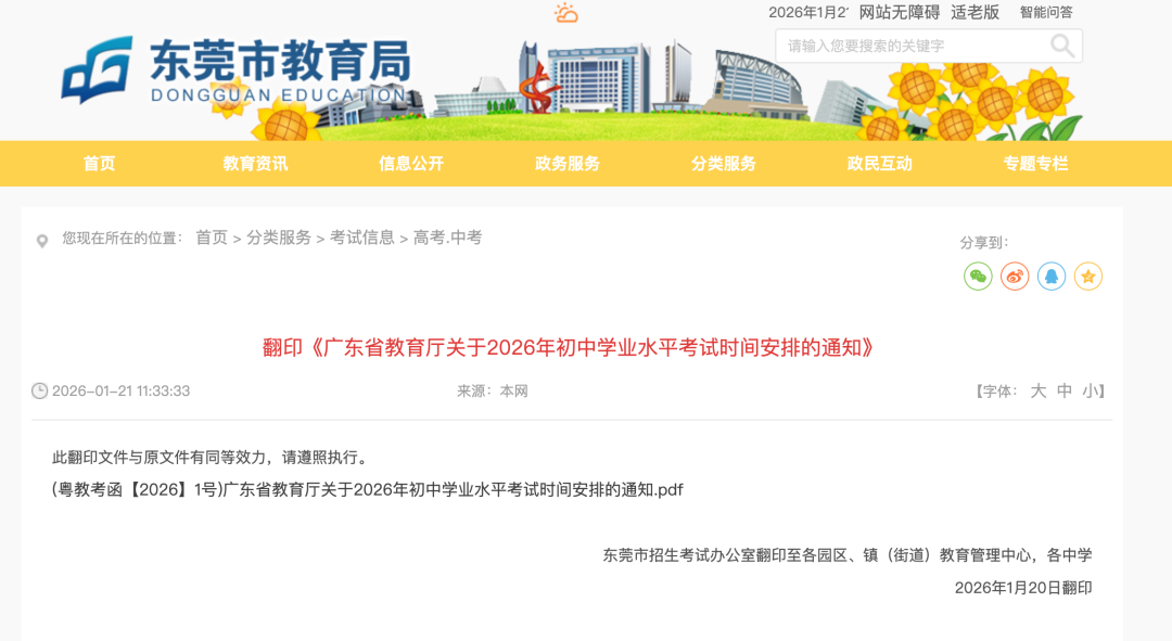 1月21日,东莞市教育局官网发布信息显示,根据《广东省教育厅关于2026 年初中学业水平考试时间安排的通知》,2026年广东省统一命题地市的初中学业水平语文、数学、英语、道德与法治、历史、地理、物理、化学和生物学等科目考试时间为6月30日至7月2日。